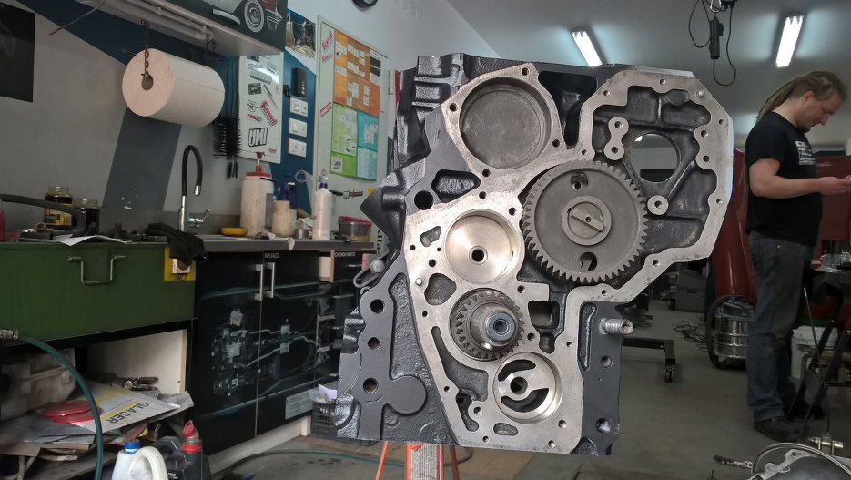 Przód silnika i rozrząd. O tyle ciekawy, że nie ma paska ani łańcucha, są tylko koła zębate. Pewnie diesel tak klekocze, że nie słychać wycia tych kół :). Widać dolne, mniejsze koło wału korbowego, wyżej po prawej - koło wałka rozrządu.