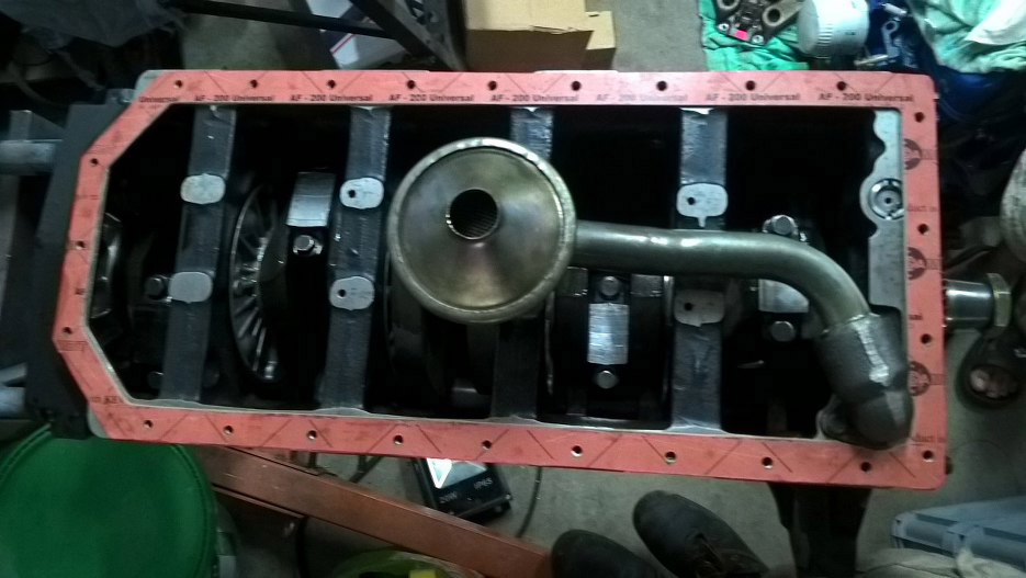 Po złożeniu układu korbowo-tłokowego przykręciliśmy smok pompy oleju. Powyżej, po prawej, widać w bloku mały otwór - to jest zaworek zwrotny i regulacja ciśnienia oleju. Tam też zaglądaliśmy.
