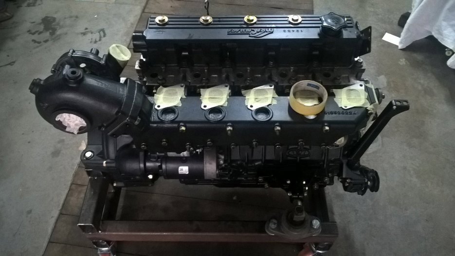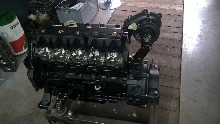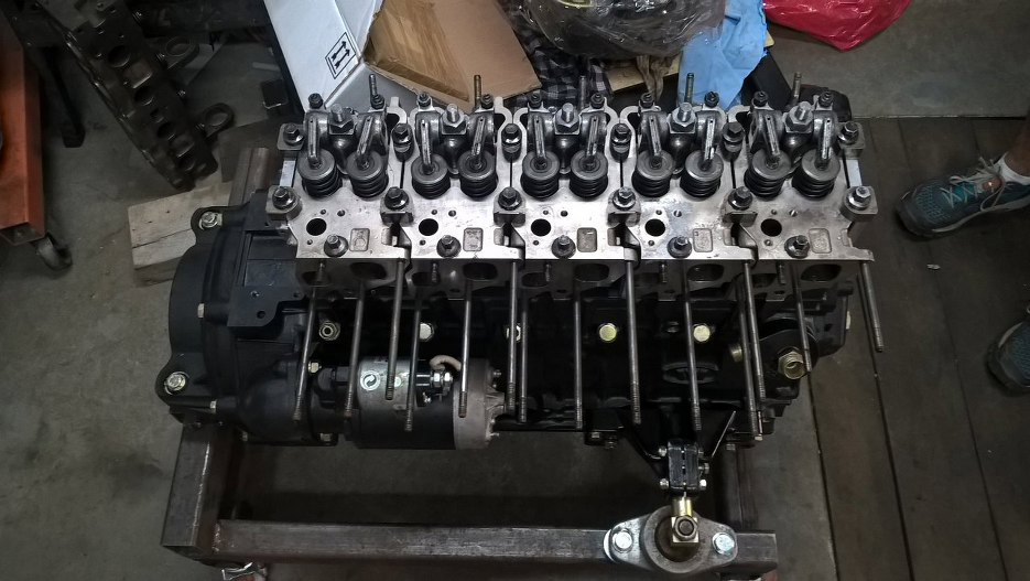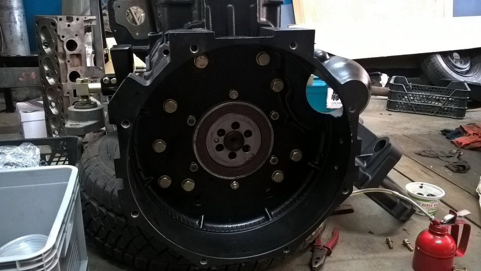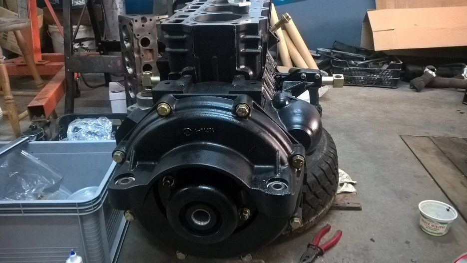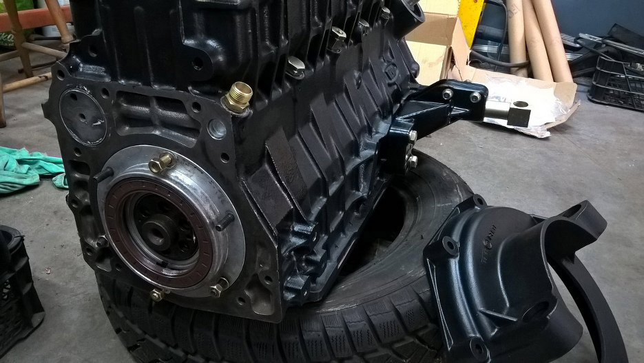 Potem silnik zaczął robić się za ciężki, nawet na mój najmocniejszy stojak. Dlatego zdjęliśmy go ze stojaka. Przykręcone zostały łapy silnika. Z tyłu bloku włożyliśmy ostatnią stopę wału z panewką oporową i simmeringiem. Po prawej widać obudowę koła zamachowego, też już odnowioną.