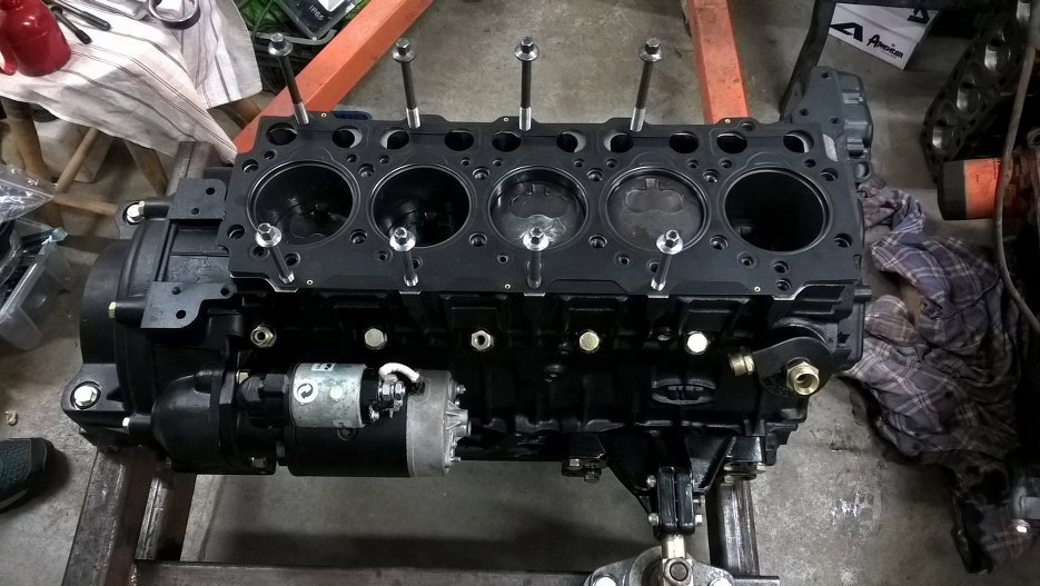 Potem założyliśmy uszczelkę głowicy. Oryginalnie każda głowica miała swoją oddzielną uszczelkę, ale zastosowaliśmy uszczelkę nowszego typu, jedną na cały blok. Widać też, że zamontowany został rozrusznik.