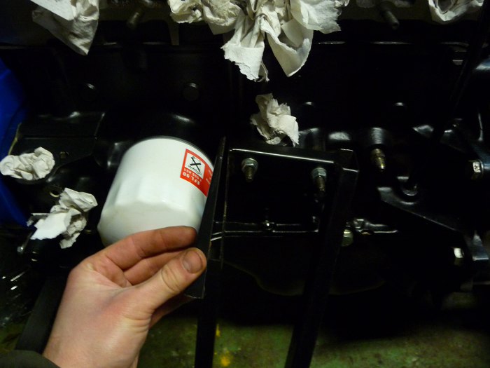 I kolejne utrudnienie - robiąc stojak na silnik nie miałem filtra oleju. Teraz się okazało, że przeszkadza. Coś musiałem wyciąć - albo filtr, albo łapę silnika. Po dłuższym wahaniu wybrałem łapę :) Wycięty kawałek wspawam z powrotem, żeby to nadal sztywne było, bo w planach jest odpalanie silnika na tym stojaku.