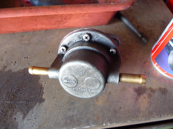 Żeby olej z silnika nie wyciekał trzeba zatkać jeszcze dwie dziury w układzie smarowania. Pierwsza to dziura na czujnik ciśnienia oleju; do niej podłączę wskaźnik ciśnienia oleju z granady, żeby zobaczyć jakie te ciśnienie jest. Druga to miejsce na pompę paliwa - tam jest smarowany popychacz. Wygrzebałem starą pompę od tego silnika i stwierdziłem że dobra-niedobra, ale założę.