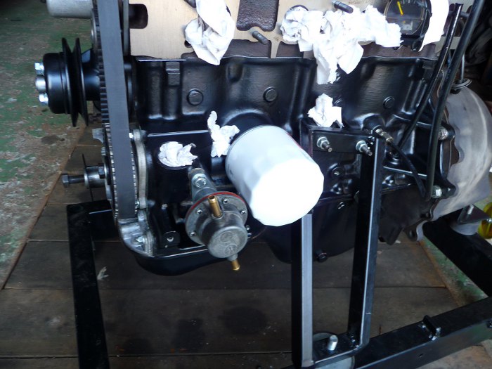 Chciałem już nalać oleju, żeby móc pokręcić pompą oleju i naoliwić silnik. Sprawdzając wszystko po kolei zauważyłem, że jak zakładałem miskę olejową, to korek spustowy zostawiłem (po malowaniu) wkręcony od środka... No i znowu silnik na stojak, odkręcanie dzwonu, koła zamachowego, miski, poprawienie korka, założenie wszystkiego...
