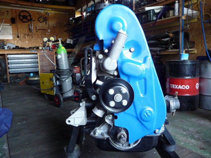 No i wszystko razem poskładane. Założona obudowa termostatu z termostatem, pokrywa rozrządu, po lewej stronie widać pomalowane na srebrno mocowanie alternatora. Z przodu silnika brakuje już tylko koła pasowego wału i paska klinowego.