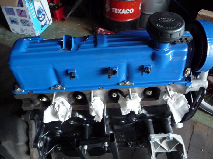 Zacząłem przykręcać pokrywę zaworów, chociaż nie mam jeszcze wszystkich podkładek pod śruby, ale latało to luzem i nie chciałem, żeby tam jakieś brudy naleciały. Potem włożyłem (wzorując się na leżącym w garażu oryginalnym silniku) plastiki (znowu oryginały Forda) trzymające przewody zapłonowe do pokrywy; przy korku wlewu oleju widać też oryginalną, nową gumkę mocującą przewody. Wszystko to zostało zakupione dzięki katalogowi części przygotowanemu przez kolegę Konara znajdującemu się tu: www.fordopedia.org. Części dostarczył Chuder Capri Service.
