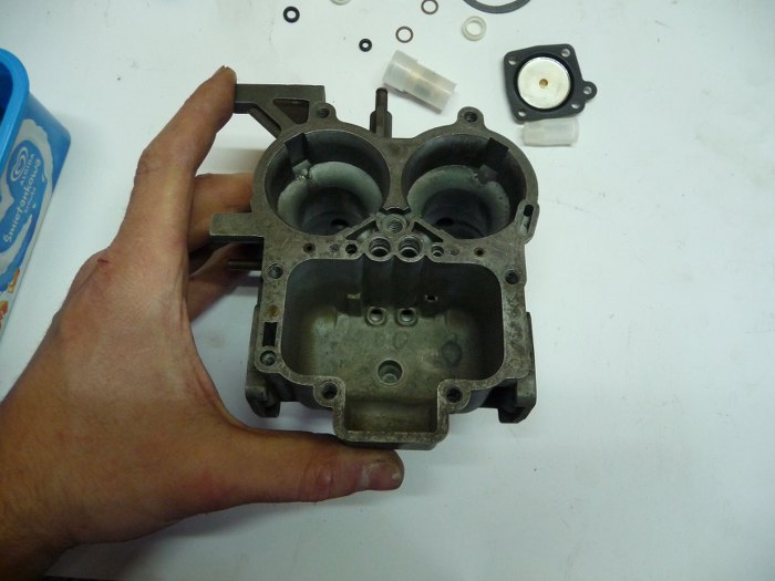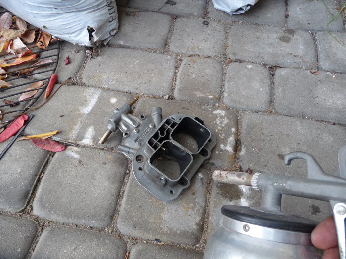 Jakiś czas temu kupiłem pistolet do piaskowania, który nie za bardzo do czegokolwiek się nadawał. Do czyszczenia gaźnika jednak nadaje się idealnie, bo piaskuje bardzo delikatnie, nie uszkadzając powierzchni (nawet nie jest chropowata). Do środka wsypałem zwykły piasek pozamiatany z podwórka :)