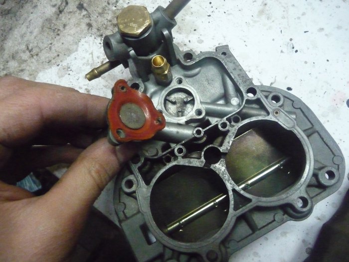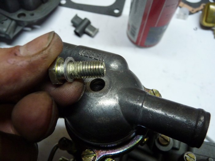 Pod śrubą też musi być uszczelka. Tędy płynie płyn chłodzący grzejąc bimetal, który otwiera klapki ssania.