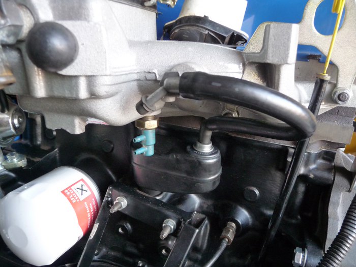 Niestety z gaźnika zaczęła wypływać benzyna - górą. Kilka razy rozkręcałem gaźnik w celu poprawienia pływaka i zaworka iglicowego, ale na próżno. W końcu się zorientowałem, że z węża powrotnego nie wypływa benzyna... mimo, że zaworek działa. drucik wetknięty w króciec powrotny nie przedostawał się do wnętrza gaźnika. Po krótkim wahaniu zdecydowałem się "wyczyścić" przelot wiertełkiem na wiertarce :). Mimo obaw, że coś zepsuję, operacja się udała, benzyna wreszcie zaczęła wracać do tego czaderskiego zbiornika paliwa. Sęk w tym, że teraz silnik odpalał tylko jak psikałem w niego paliwem lub brake cleanerem (to bardzo uniwersalny środek :) ). W tym momencie stwierdziłem, że pewnie coś sknociłem wiercąc w gaźniku... Znowu zdjąłem pokrywkę gaźnika i okazało się, że tym razem odwrotnie założyłem pływak :) Wreszcie problem rozwiązany, silnik pracuje!
