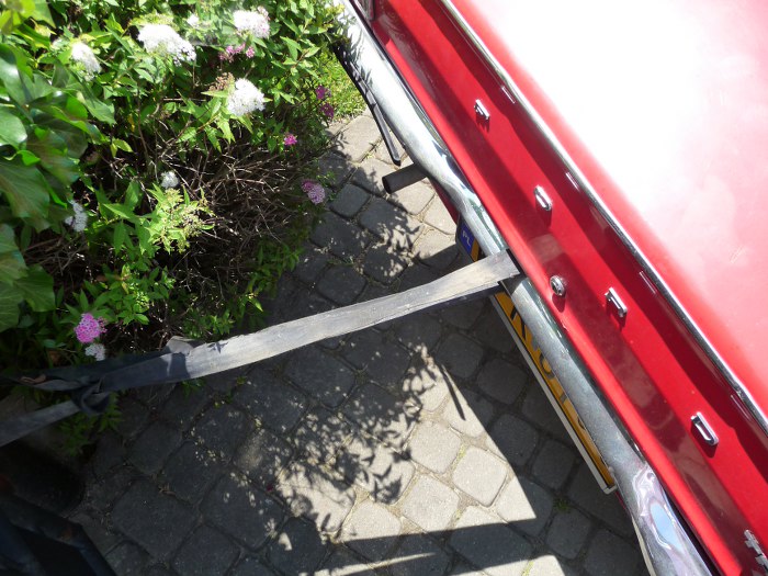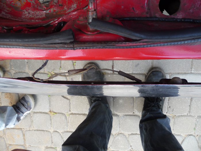 Tylny zderzak jest krzywy. Prostowanie w sumie zostawię dla kolegi blacharza, ale chociaż trochę muszę go odciągnąć od karoserii, żeby jej nie dotykał. Najprościej to zrobić przywiązując zderzak do słupka od bramy :)