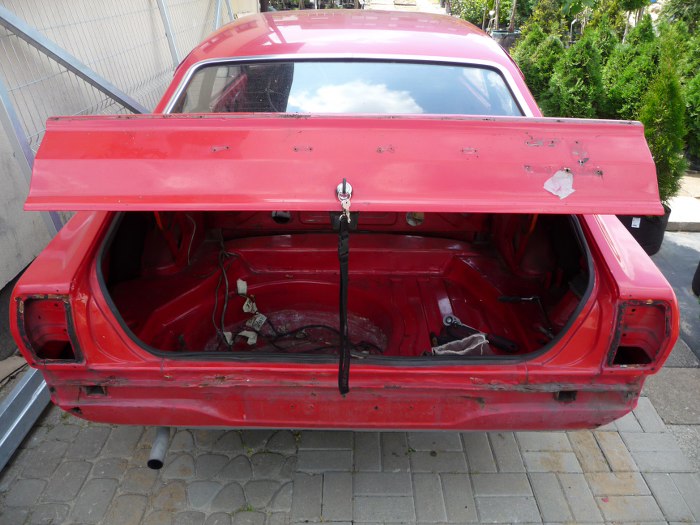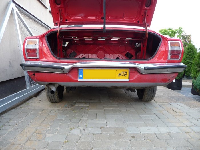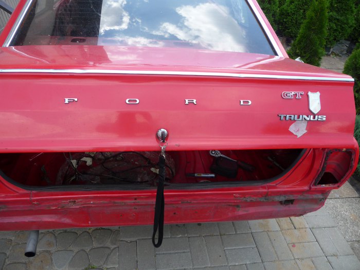 Pora na detale z klapy. Oczywiście widać tu radosną inwencję twórczą - tarcza jest emblematem z błotnika, a napis TAUNUS jest z nowszego modelu. Wszystko jest przyczepione nie tam, gdzie trzeba, ale ktoś sobie zadał na tyle dużo trudu, że emblematy są przyczepione na oryginalne bolce mocujące, czyli w tylnej klapie są porobione dziury.