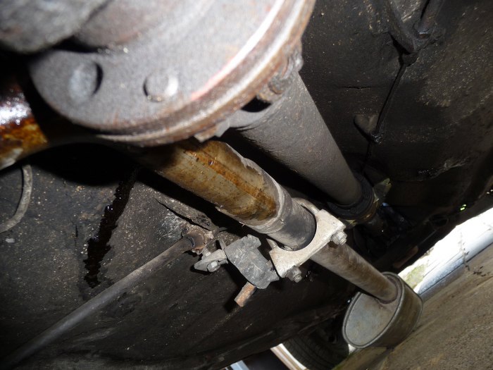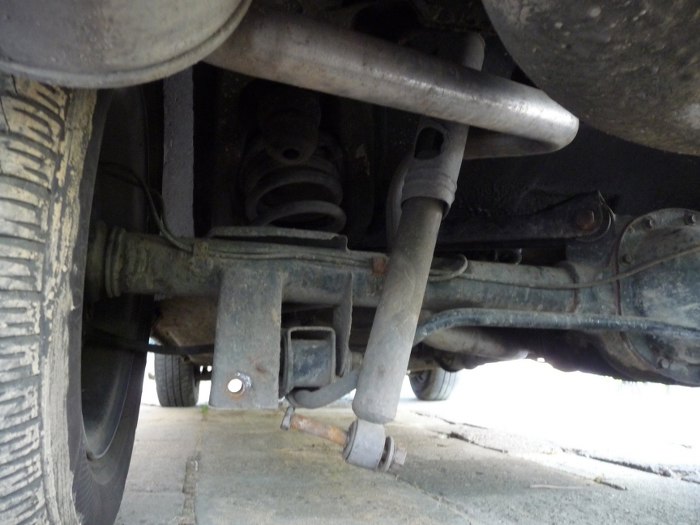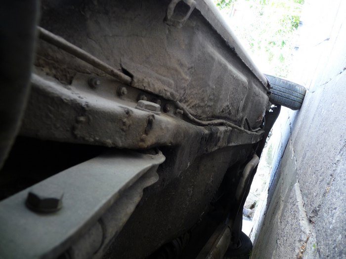 Zmieniamy miejsce - widok na tylną prawą podłużnicę. Widać naprawę blacharską z użyciem śrub. Bardzo ciekawa, twórcza technologia.