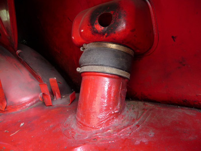 Po odkręceniu zbiornika paliwa mogę też zdjąć tą gumę łączącą otwór w podłodze bagażnika z otworem w błotniku tylnym. Widać dziurę po rzurze gazowej - wlew był zamontowany pod klapką wlewu paliwa.