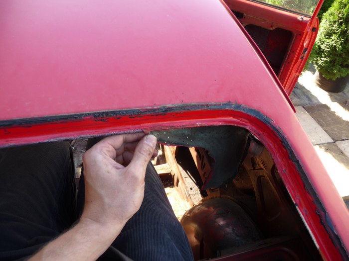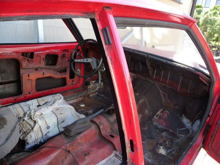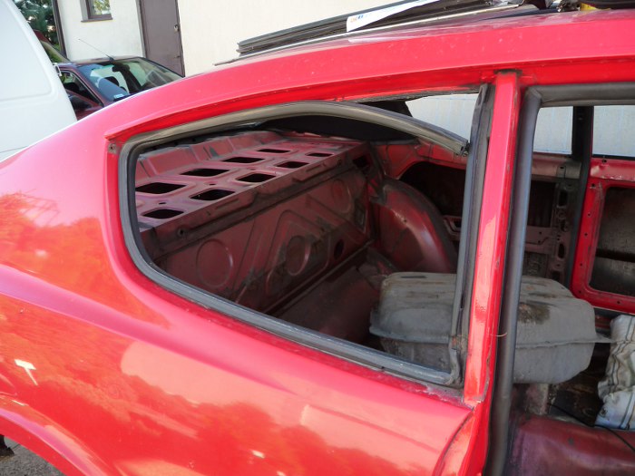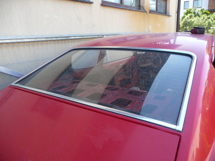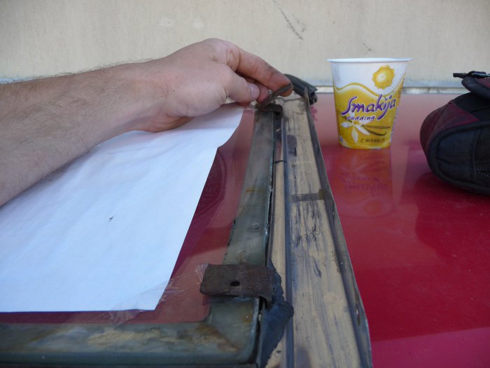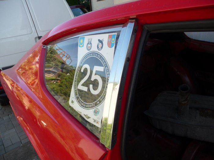 Zaczynam od tylnych szybek uchylanych. Uchylane to one kiedyś były, ale pewnie się coś zepsuło i już nie są - patrz na kątownik po lewej. Okienko jest zamknięte na głucho.