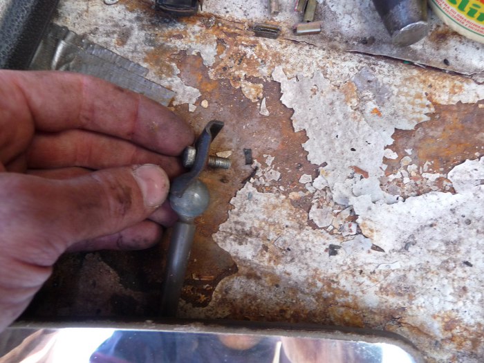 I już widzimy co nie działa. Uchwyty trzymające szybę w słupku są zupełnie pordzewiałe, jednego nie ma, drugi, który trzymam, zaraz się urwie.