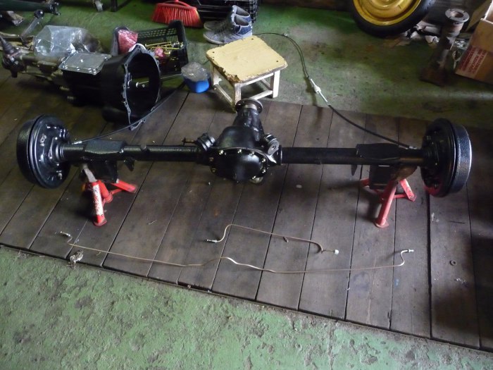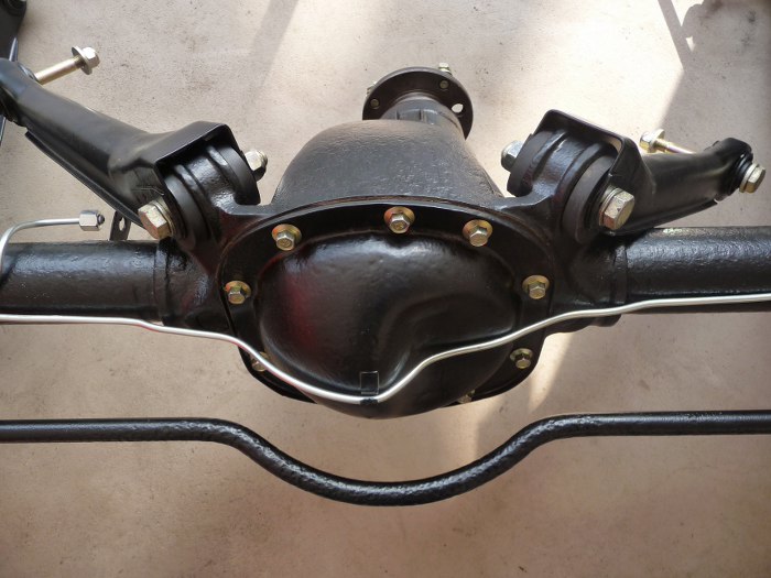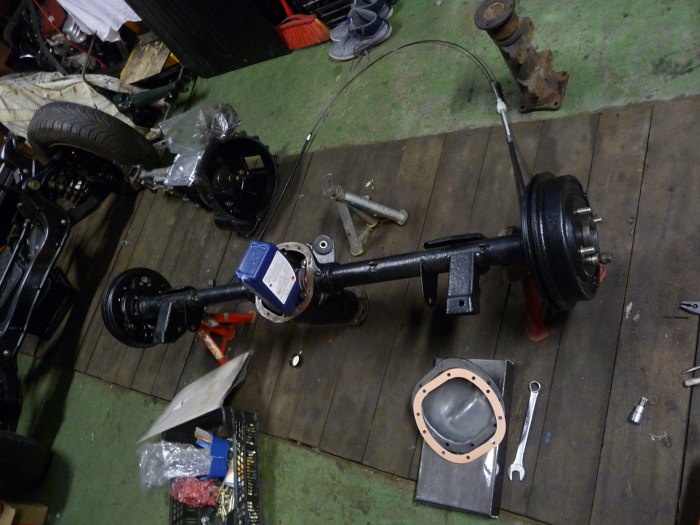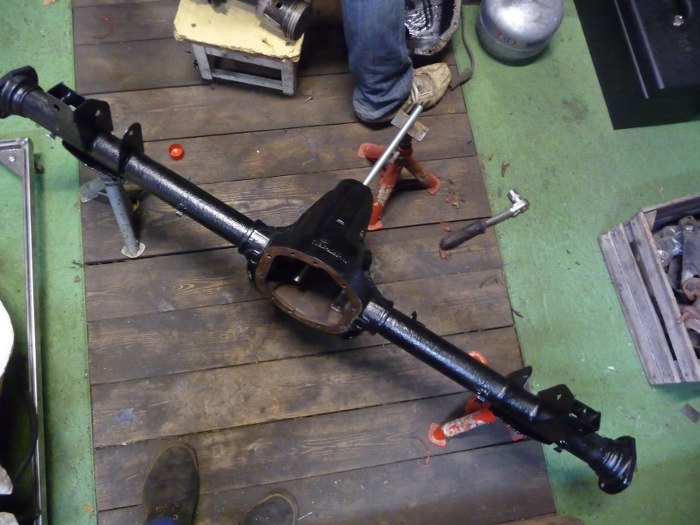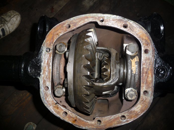 Kolejność prac była dość dziwna, bo miałem problemy z jednym łożyskiem półosi. Dlatego najpierw skończone były hamulce, potem wahacze, a dopiero teraz wziąłem się za zamknięcie mechanizmu różnicowego. Nalałem oleju przekładniowego, a czekająć aż ścieknie z butelki do wnętrza mostu porządnie wyczyściłem wewnętrzną stronę pokrywy mostu po piaskowaniu.