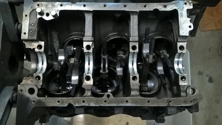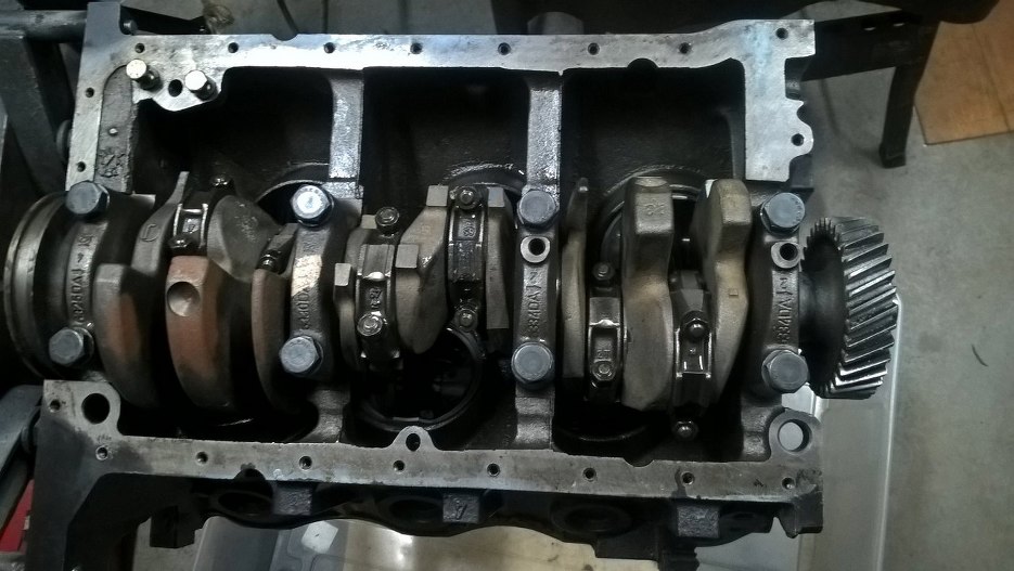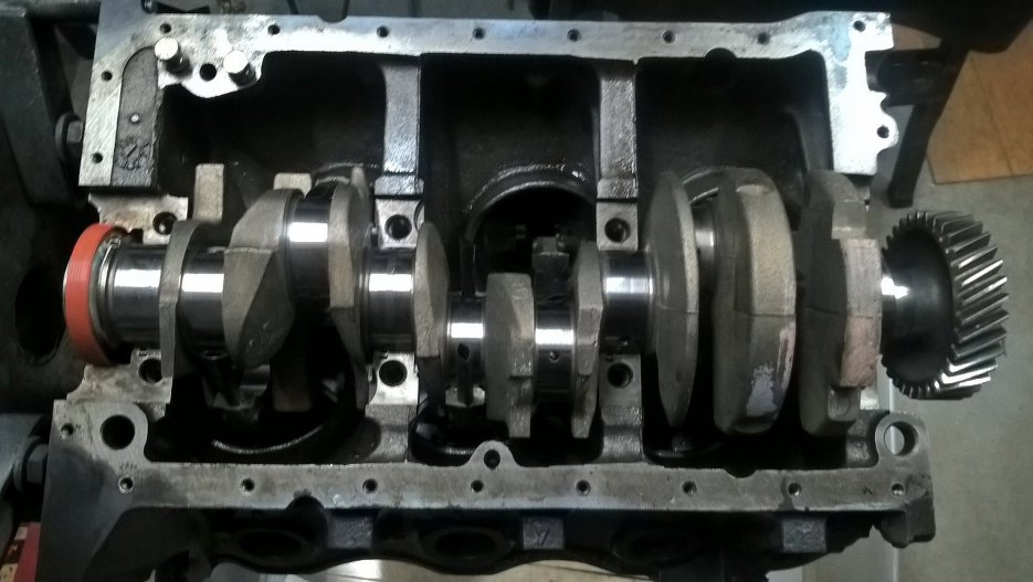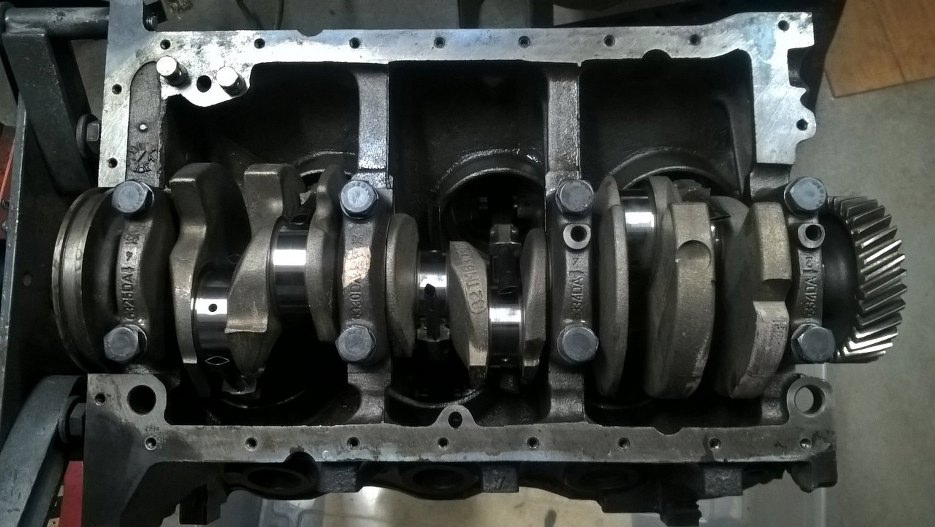Wał został umyty, nowe panewki korbowe założone. Silnik został naoliwiony, żeby nie korodował po myciu. Następnie włożyłem wał korbowy na miejsce. W ten sposób jest dużo trudniej i bardzo niewygodnie w porównaniu z wkładaniem wału, a dopiero potem tłoków. Korbowody bardzo przeszkadzają w umieszczeniu wału w bloku.