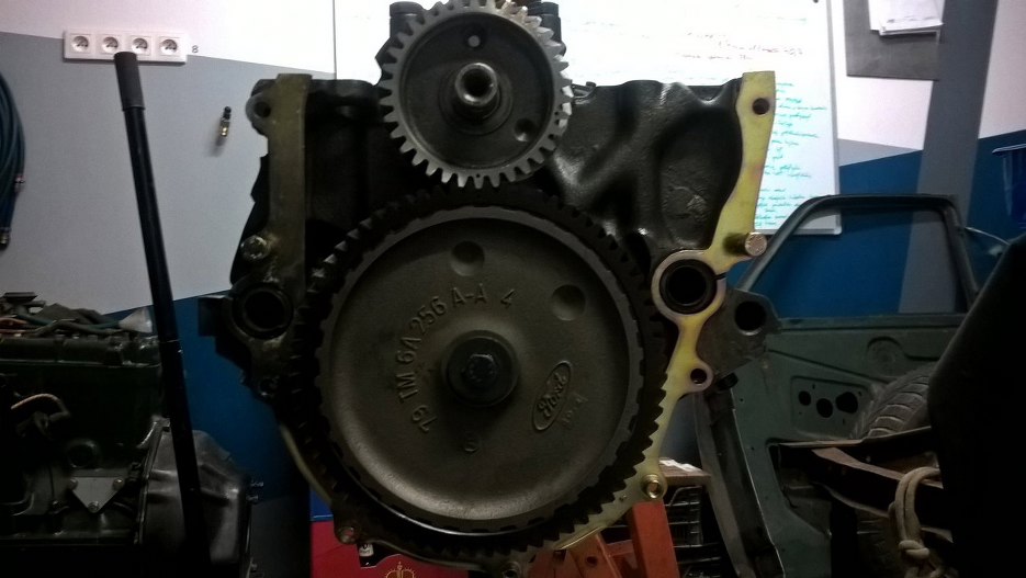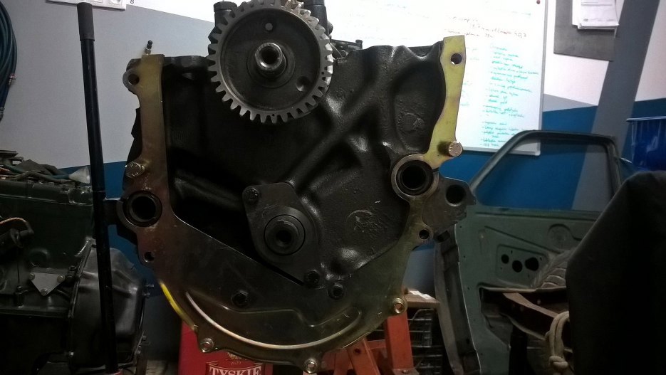 Następnie przykręciłem dwiema śrubami z płaskim łbem blachę pośrednią. Śruby widać na dle, to te dwie czarne pod wałkiem rozrządu. Na tym etapie silnik wisi nadal do góry nogami (a może do góry korbami?) bo tak jest wygodniej.