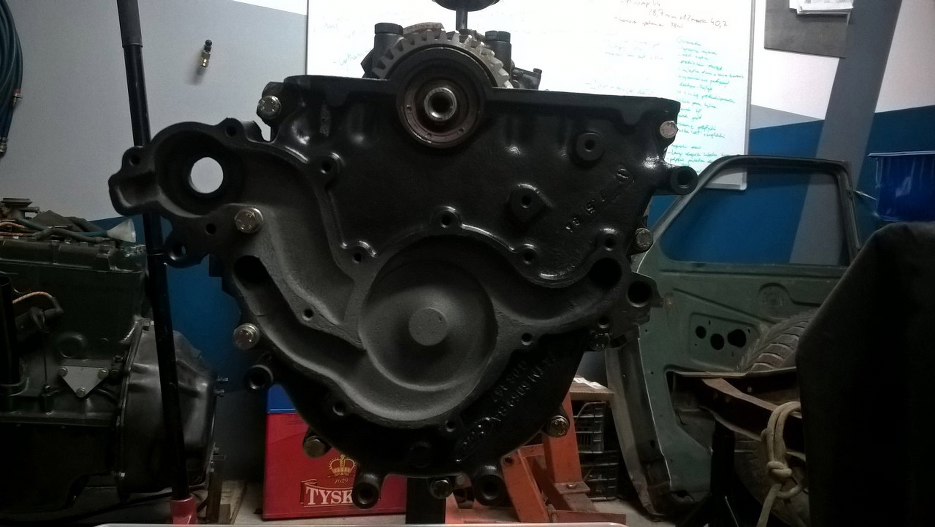 Można już przykręcić pokrywę rozrządu. Zanim ją przykręciłem naoliwiłem ją od wewnątrz, żeby nie zaszła korozją - nie wiem kiedy następnym razem do tego silnika zię zabiorę, a pokrywa była piaskowana, więc była zupełnie czysta. Każda wilgoć mogła tu zaszkodzić. Widać tu te dwa kanały wodne po bokach wychądzące z bloku.