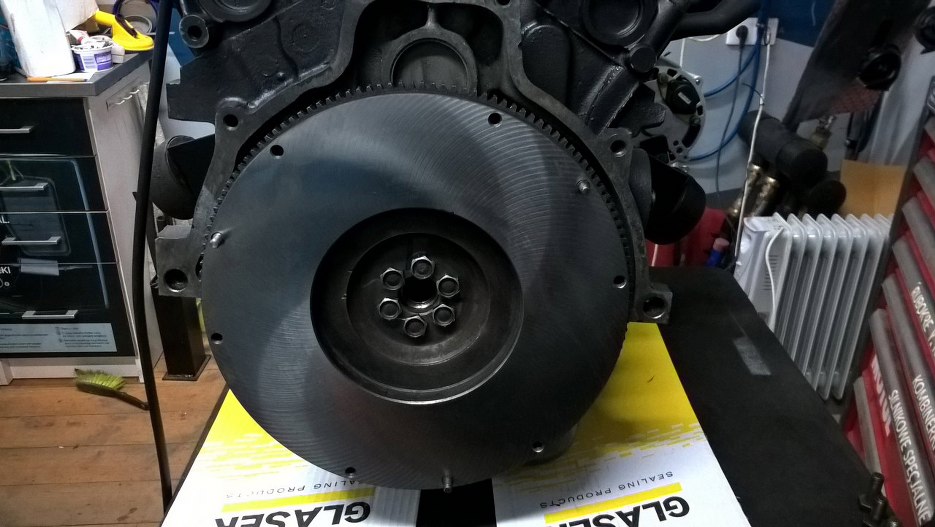 Na tym etapie mogłem już zdjąć silnik ze stojaka. Przykręciłem koło zamachowe. Na stojaku się nie da, nie mieści się. Koło było planowane.