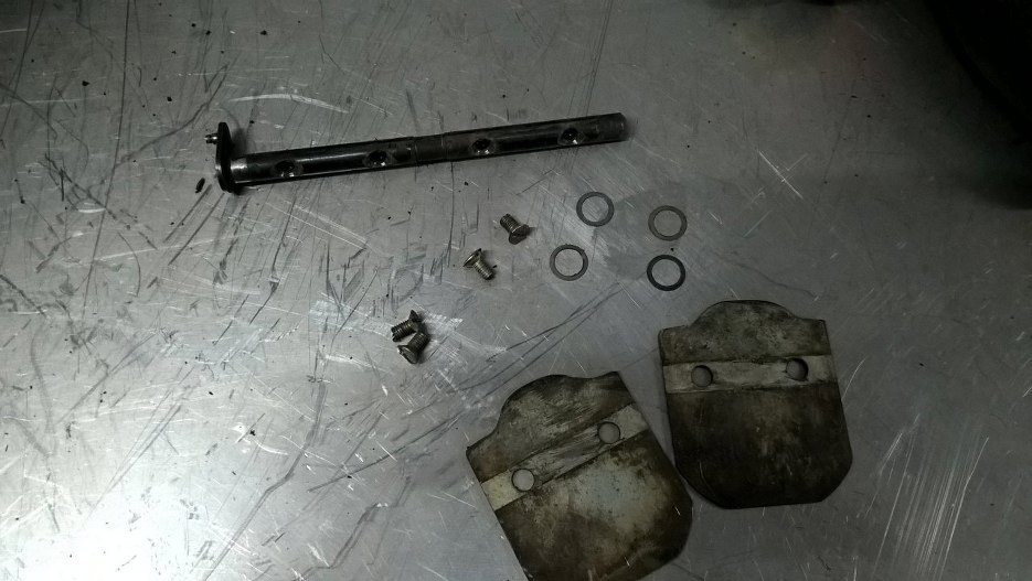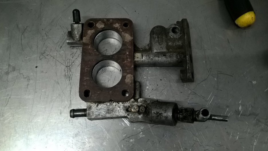 Gaźnik. Silnik do tej pory działał, więc powinno pójść w miarę łatwo, czyszczenie i zestaw naprawczy. Zacznę od podstawki pod gaźnik. Nagle okazało się, że nasi tu byli... zobacz na śruby wkręcone w miejscu zaworka powietrza. Chyba nawet to tak zostawię, bo te zaworki i tak nigdy nie działają, a jak to wykręcę, to zaraz nie uszczelnię.