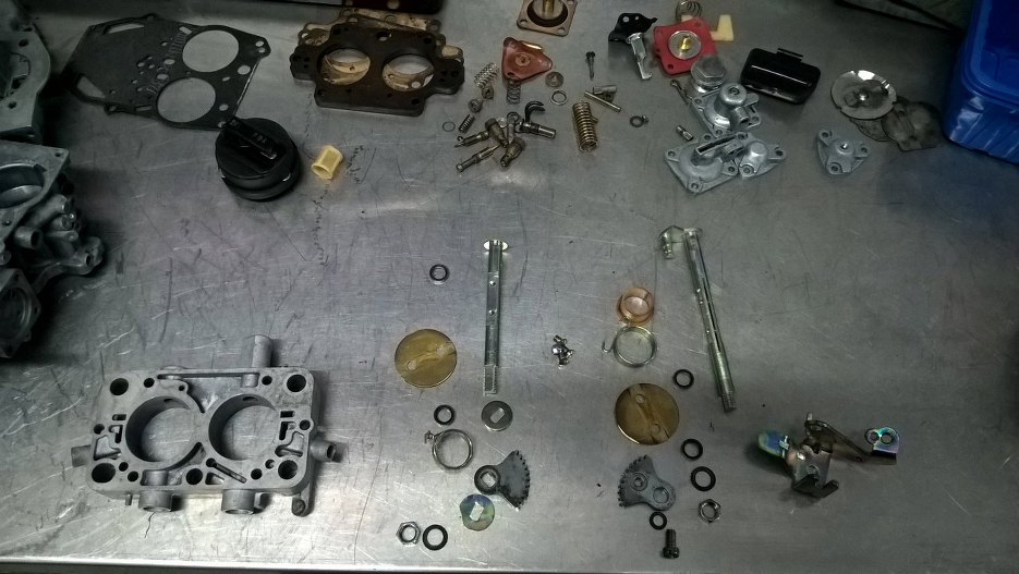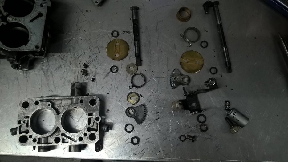 Przygotowałem wszystkie części składowe - elementy korpusu gaźnika są domyte ręcznie, a następnie w myjce ultradźwiękowej, śrubki ocynkowane i tak dalej.