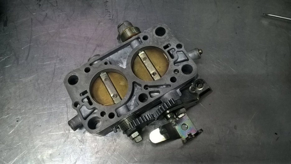 Rozłożyłem mechanizmy przepustnic. Zębatki nie są idealne, trochę zużyte, ale póki co zostaną. Jeśli będzie problem w regulacji obu stron gaźnika, to wtedy pomyślę o wymianie.