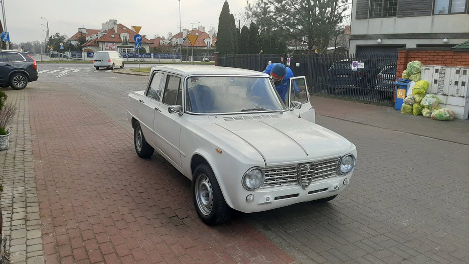 Przyjechała do mnie taka Alfa. Ta, przyjechała :). Oczywiście, jak na Alfę przystało, została przywieziona na lawecie :). Jest to niedawny zakup Sebastiana. Wylicytowana w ciemno w Grecji. Od spodu zdrowa, z wierzchu trochę dziwna, lakier na jakieś 10. Czyli z 10 metrów dobrze wygląda :). W sam raz na auto do zabawy. Niestety mechanicznie trochę niedomaga - nie chce pracować, biegi nie wchodzą za dobrze, cieknie. Estetyka auta, jak to sam właściciel określił, jest: "składana jak dla obcego". Czyli Hemoroides i Domestos składali auto na szybko, bo jakiś koleś z PL zalicytował i zaraz trzeba sprzedać :). Przód auta od starszej wersji, żeby była ładniejsza. Taki ładny kundelek jednym słowem :).