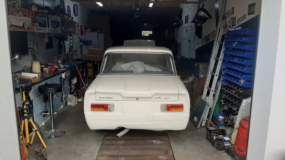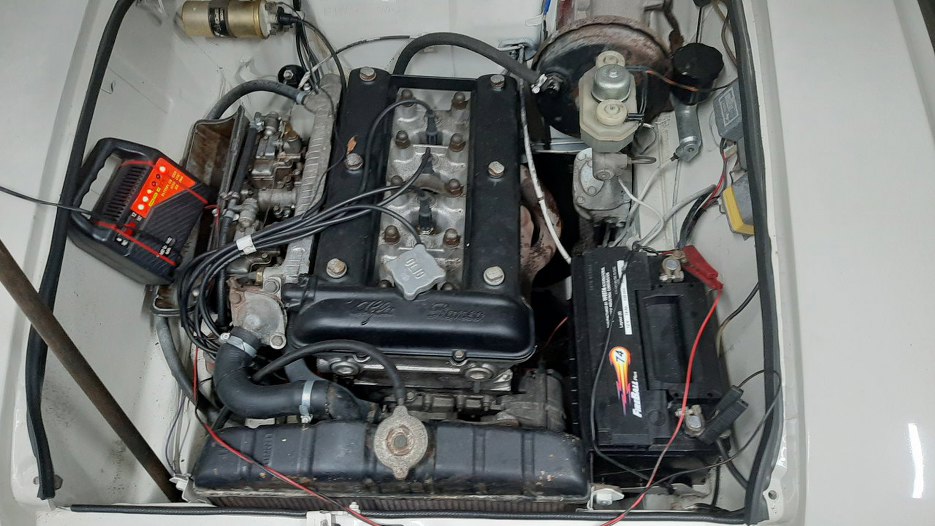 Tak że tego... właściwie nie ma co robić, nie? Przejrzeć gaźniki i tyle... Nie. Właściciel narzekał jeszcze na pracę skrzyni biegów i sprzęgło, czyli trzeba się dobrać i tam. Silnik cieknie dookoła, niestety również z przedniej części uszczelki pod głowicą, tam, gdzie jest łańcuch rozrządu. Sumarycznie - i tak trzeba wyciągnąć to wszystko, żeby porządnie przejrzeć... Tak, żeby auto odjechałojak na Alfę przystało, na lawecie o własnych siłach i tak też się poruszało dalej.