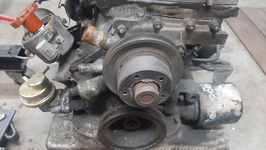 Zdjąłem wiatrak z pompy wody. Próbowałem też zdjąć kółko pasowe, ale bezskutecznie. Później, robiąc listę zakupów, okazało się, że koło pasowe jest integralną częścią pompy wody. I że obrotomierz jest napędzany linką wychodzącą z tejże pompy, ale to inna historia. Ale naprawdę tak jest :).