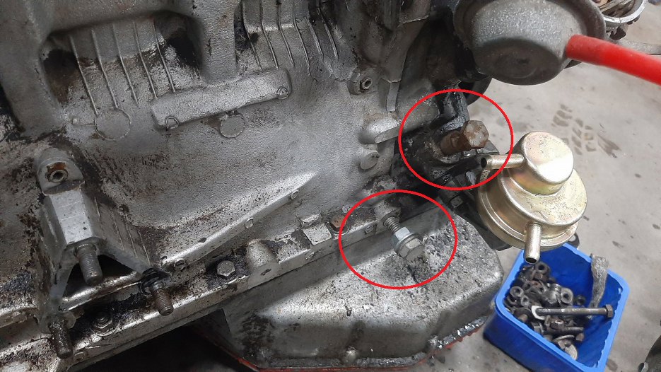 Muszę wykręcić szpilki mocujące skrzynię, bo są za krótkie do przykręcenia silnika do stojaka. Bardzo mocne to też nie są, bo są dość małej średnicy. Jedna z nich już jest zgięta. Zdjąłem też tą blachę.