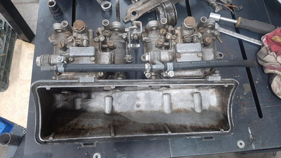 Oddzieliłem gaźniki od podstawy filtra powietrza. Gaźnikami zajmę się chyba już na końcu, za dużo drobnych części bym miał do ogarnięcia teraz.