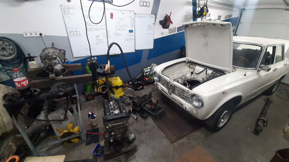 A tak wygląda obecnie pobojowisko. Skrzynia na stole, silnik jeszcze nie na stojaku, Alfa obok. Ja, w pozycji Religi po przeszczepie, robię zdjęcie.