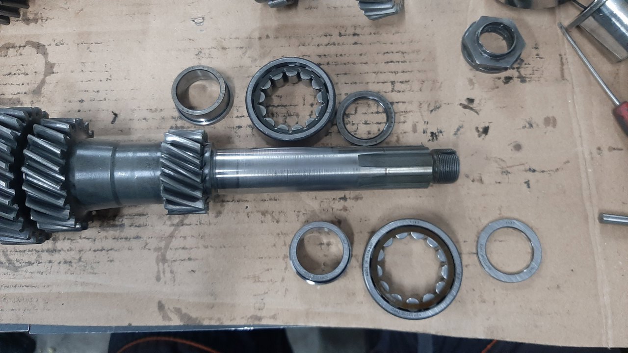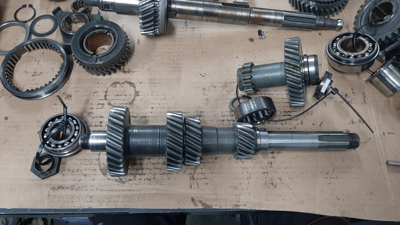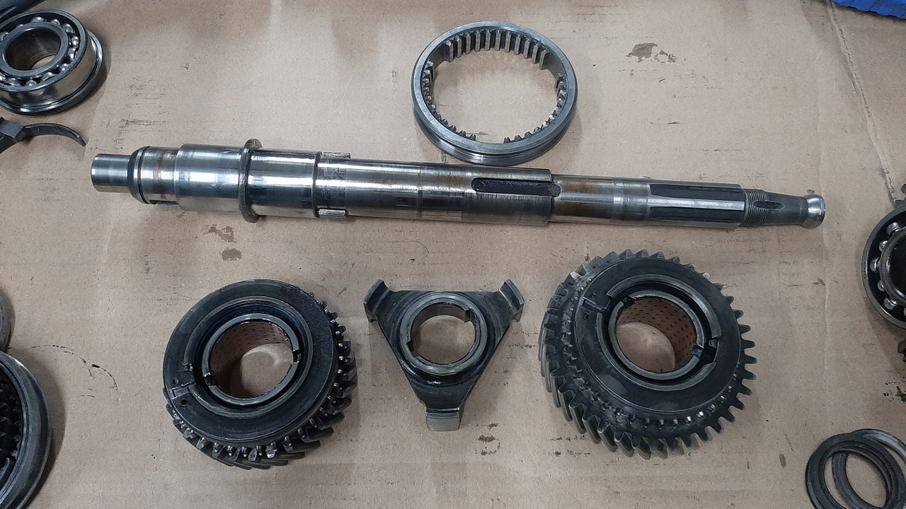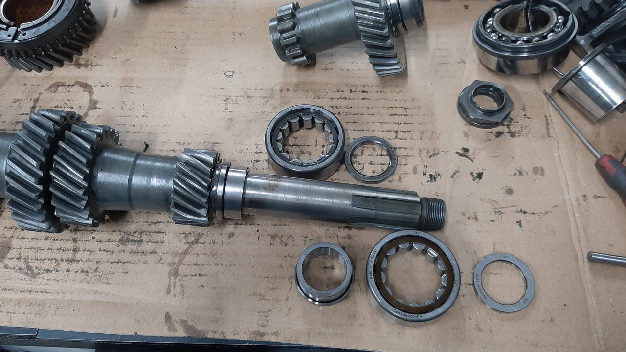 Nie wiem od czego zacząć, więc przypadkiem złapałem za wałek wyjściowy. Może być. Tu są koła zębate 1 i 2 biegu. Pod tymi szerokimi pierścieniami sprężystymi kryją się synchronizatory - a właściwie pierścienie cierne.