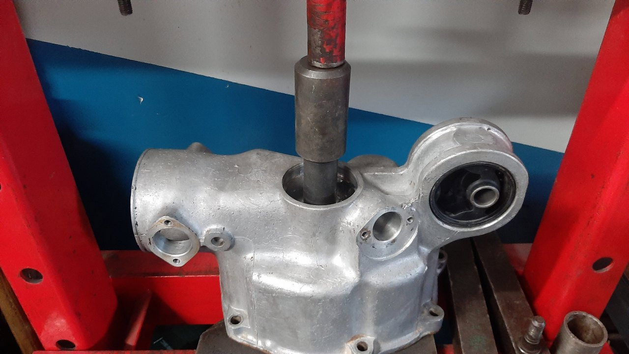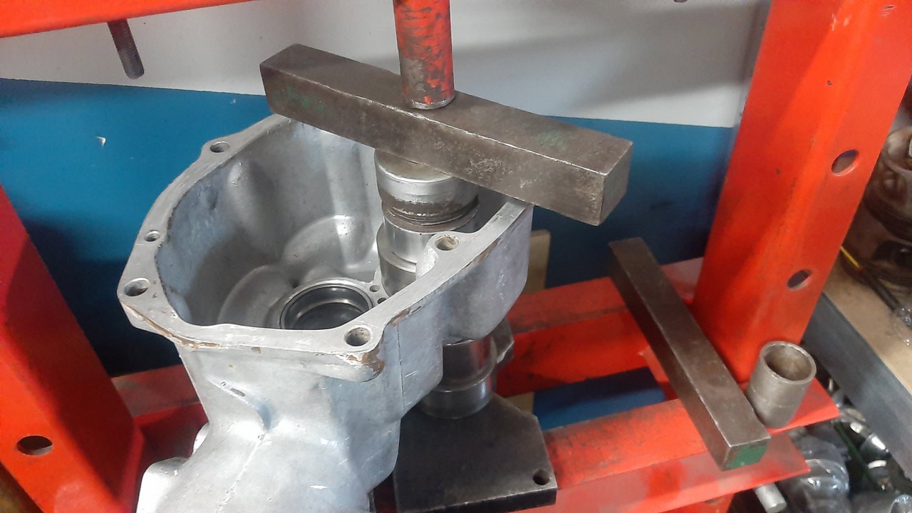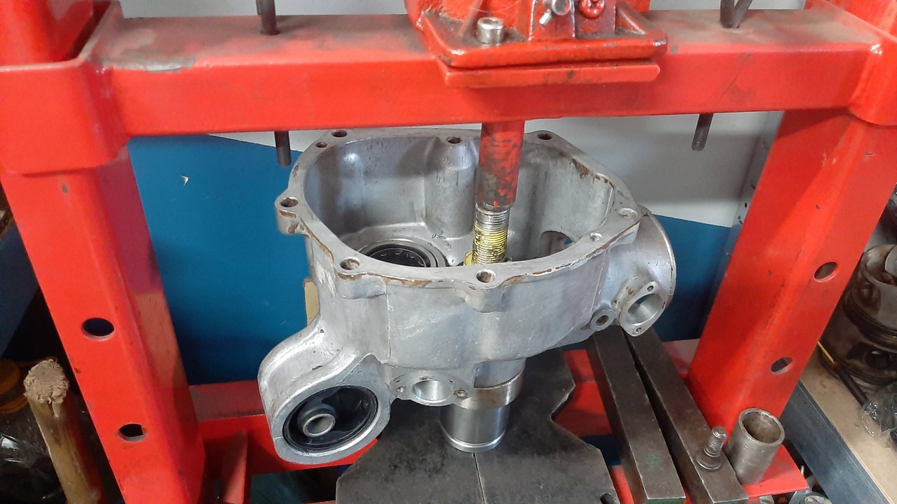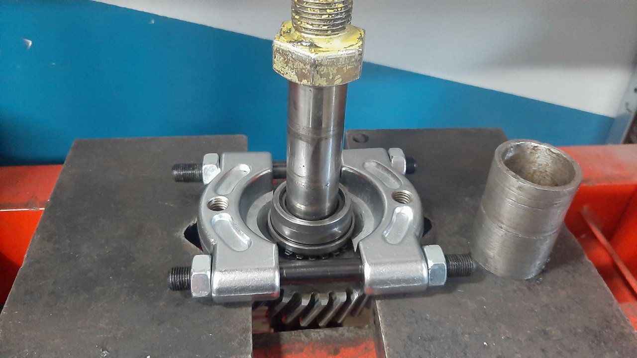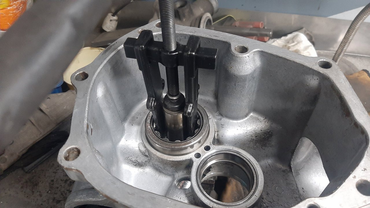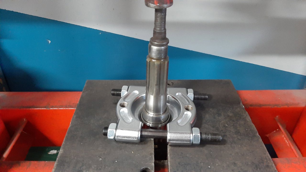 Kolejna łamigłówka - wyjęcie drugiej części tego łożyska. Poradziłem sobie ściągaczem z odwróconymi ramionami, sworzniem tłoka i końcówką prasy do zaciskania rurek hamulcowych.