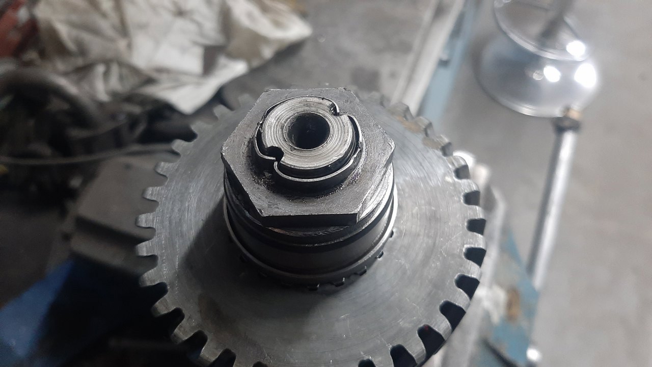 Na końcu wałka założony jest ten kawałek z zębami. Też ma na końcu bieżnię łożyska. Druga część tego łożyska jest widoczna u góry po lewej w obudowie.
