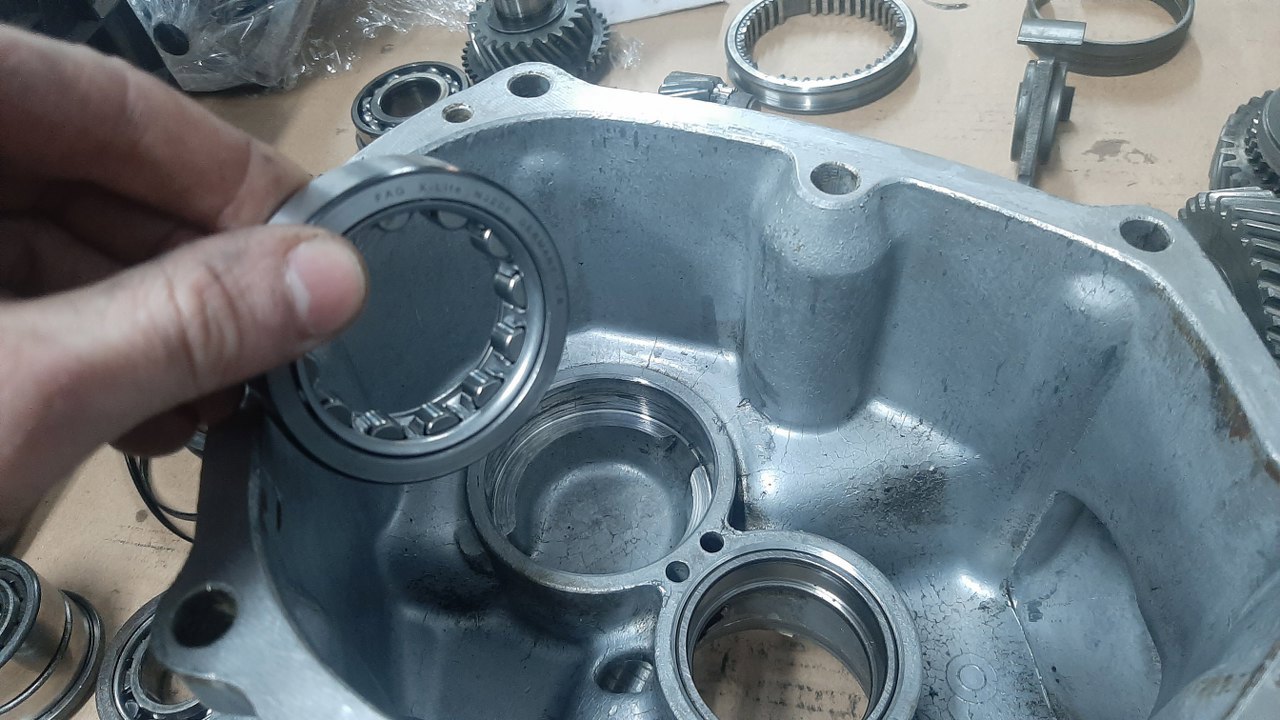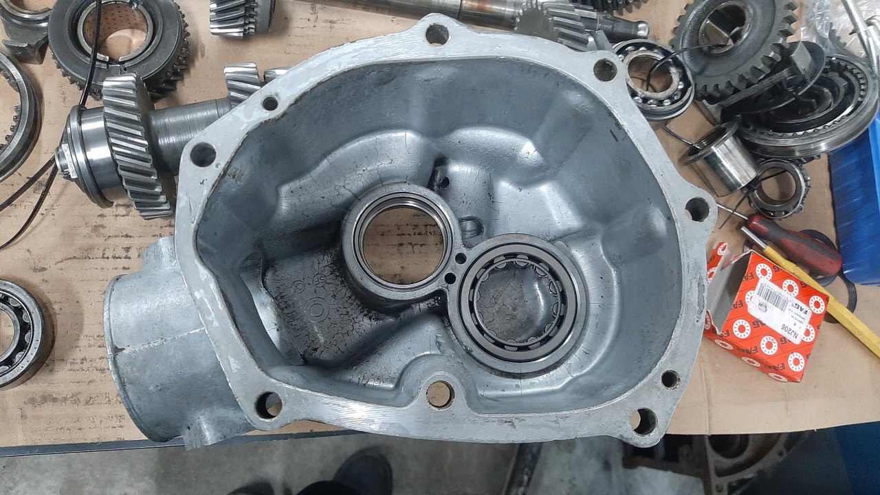 Założyłem jeszcze wybierak 3 i 4 biegu. Dalej nie mogę na razie składać - brakuje mi części do synchronizatorów 3, 4 i 5 biegu, okazało się też, że mam jedno łożysko za mało zamówione. Dlatego, póki co, włożyłem ile się dało do obudowy skrzyni. Resztę złożę po przyjściu kolejnych części.