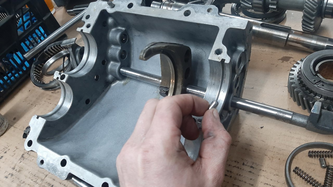 Włożyłem wybierak 1/2 biegu i pręt trzymający go w obudowie. Teraz pin blokujący wrzucenie dwóch biegów na raz.