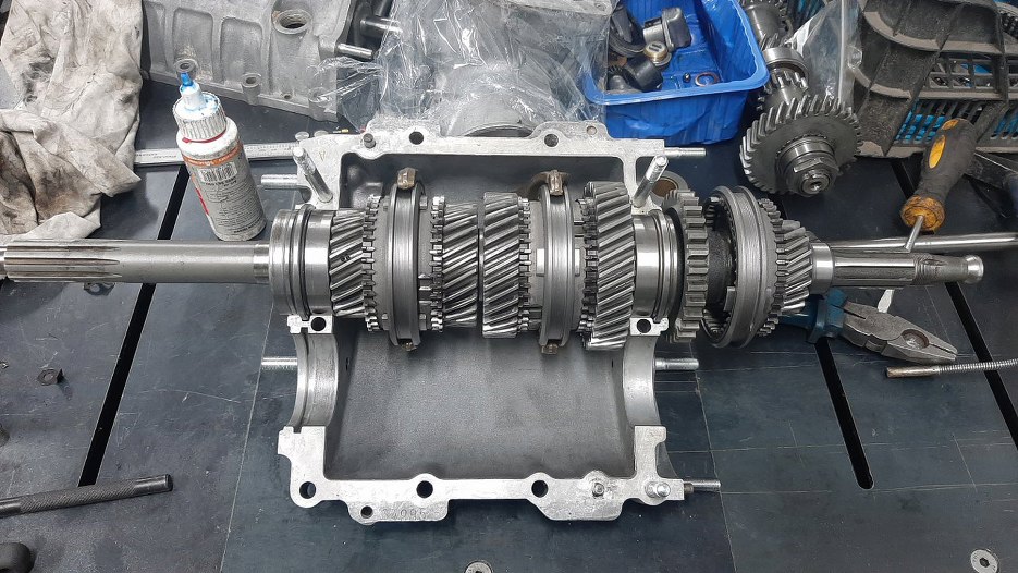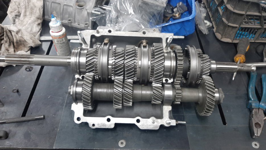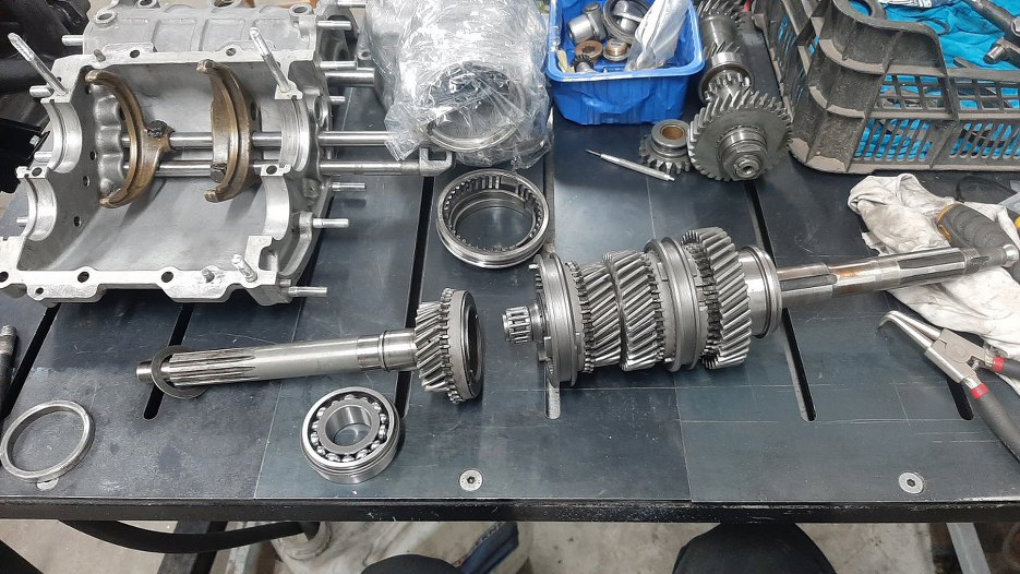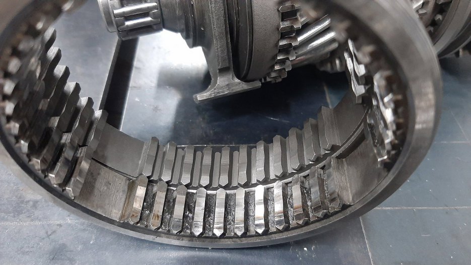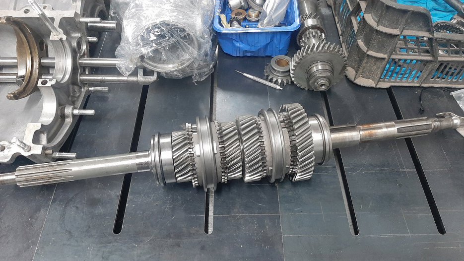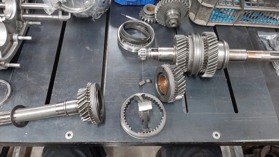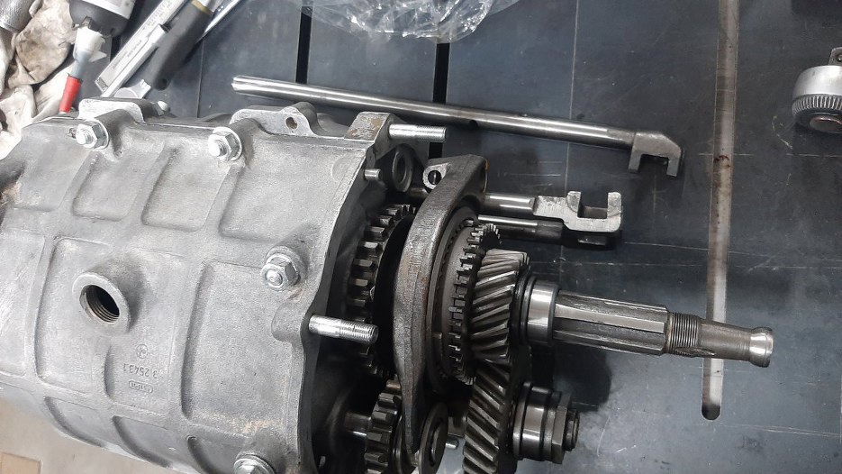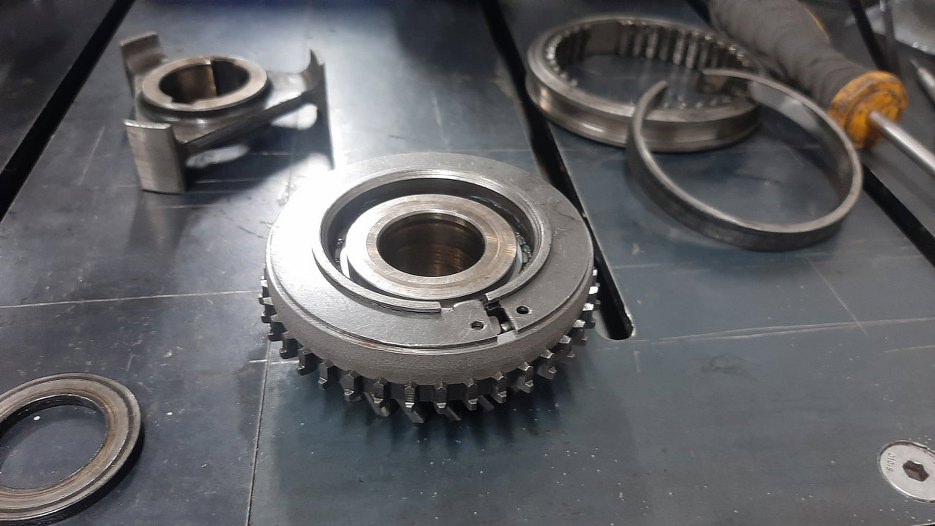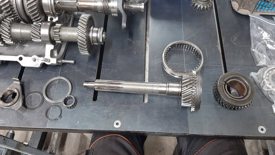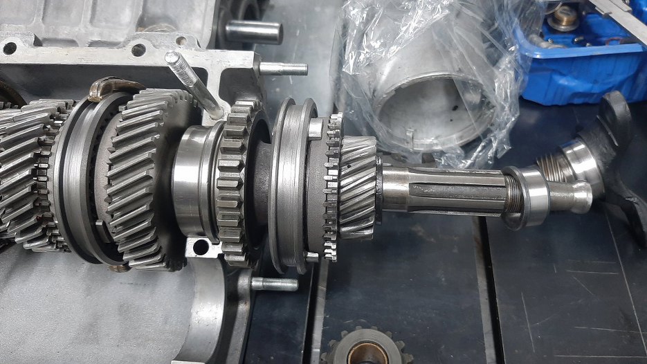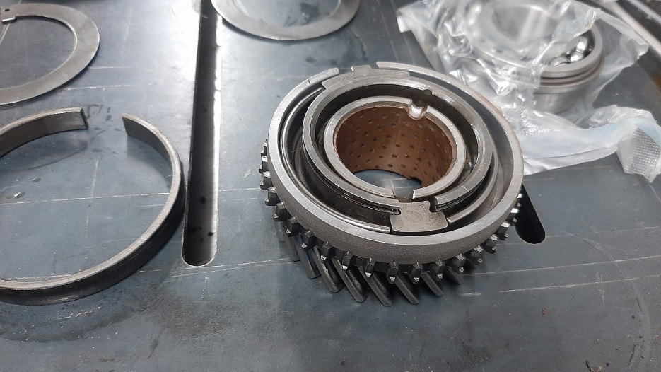 Włożyłem wałek główny do obudowy skrzyni. Założyłem koła zębate wstecznego i piątego biegu na miejsce. To koło synchronizatora też jest nowe.