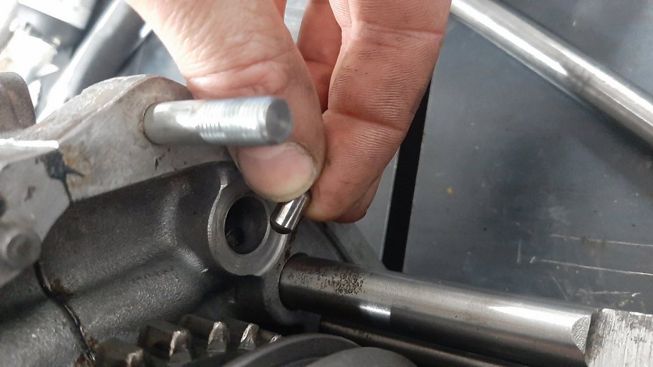 Teraz muszę włożyć pin blokujący pomiędzy pręty 3/4 i 5/R biegów.