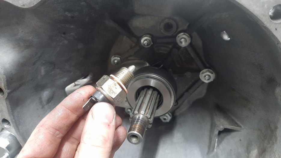Po założeniu nowej podkładki miedzianej wkręcam czujnik wstecznego biegu. Coś mnie jeszcze tknęło i sprawdziłem czujnik, czy jest sprawny. Jest.