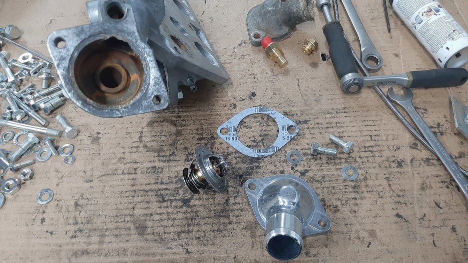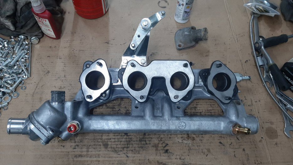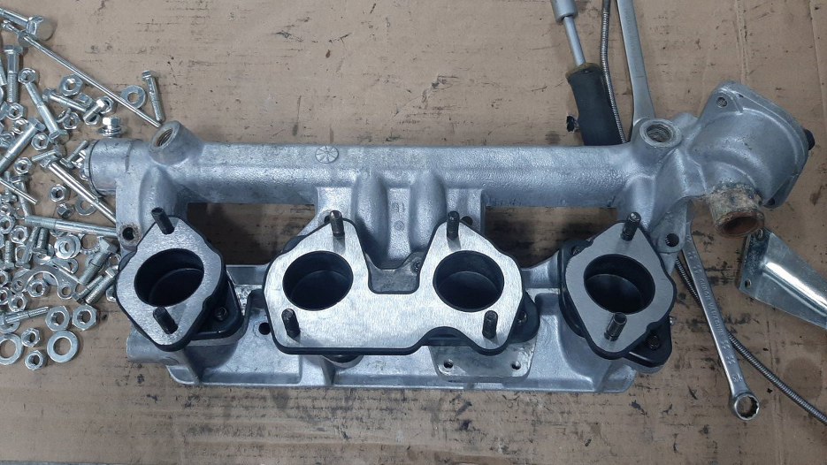 W międzyczasie Sebastian przywiózł mi zamówioną pierwszą partię części. Złożę teraz kolektor dolotowy, dzięki temu będzie coraz mniej części do przekładania. Przygotowałem kolektor, śrubki oraz nowe części - pokrywkę trmostatu, króćce, czujnik temperatury, nowe gumowo-metalowe podstawki pod gaźniki.