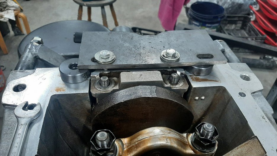 Ponieważ nie mam fabrycznego ściągacza, muszę improwizować. Wziąłem kawałek stali, nawierciłem w nim otwory na śruby i podłożyłem na blok podkładki.