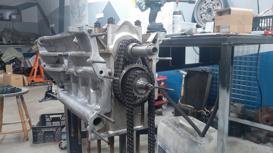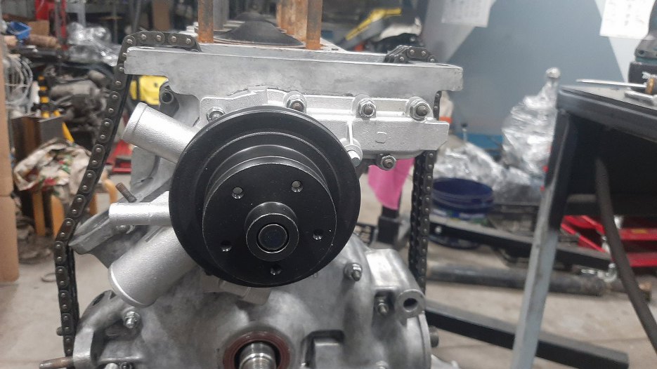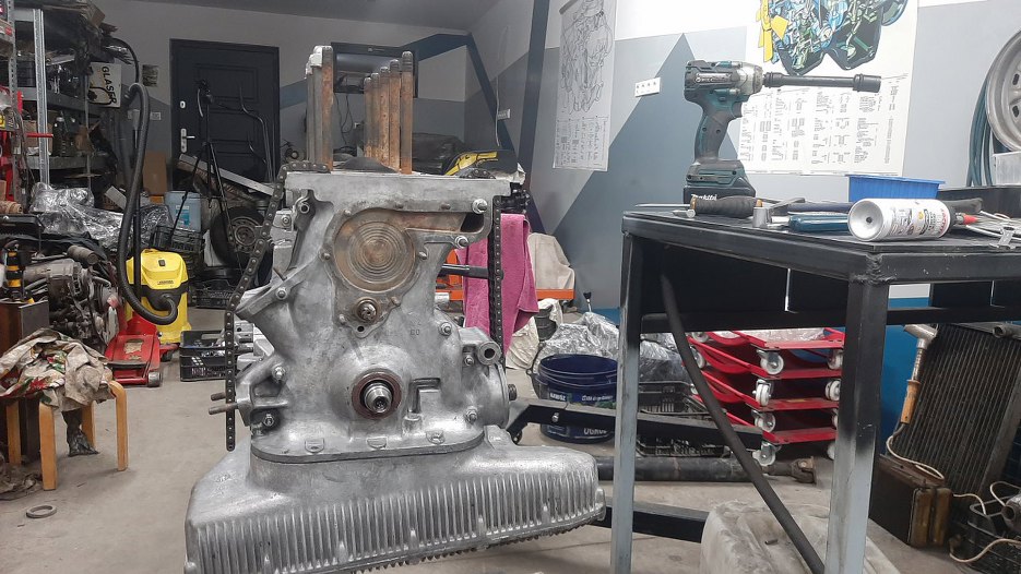 Po wyczyszczeniu przodu silnika i umyciu części rozrządu założyłem pierwszą część napędu rozrządu i łańcuch idący do głowicy.