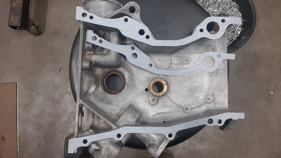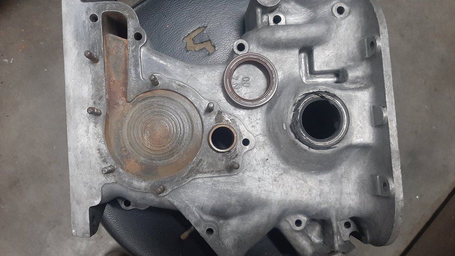 W pokrywie przedniej silnika muszę jeszcze wymienić uszczelniacz. Tuż pod miejscem na pompę wody widać otwór - przez niego wystaje zębatka z tych pośrednich kół zębatych. To ona napędza linkę obrotomierza .