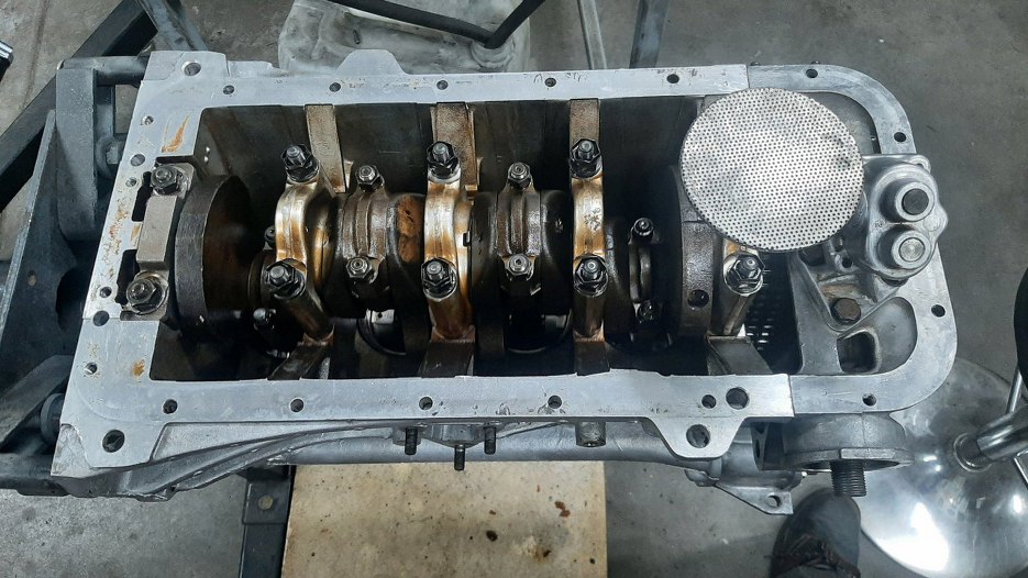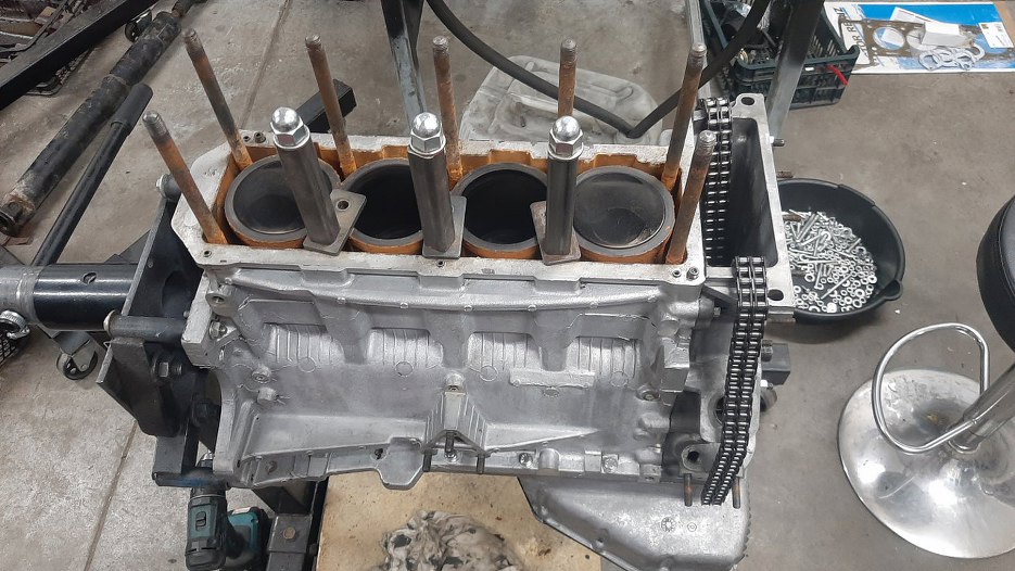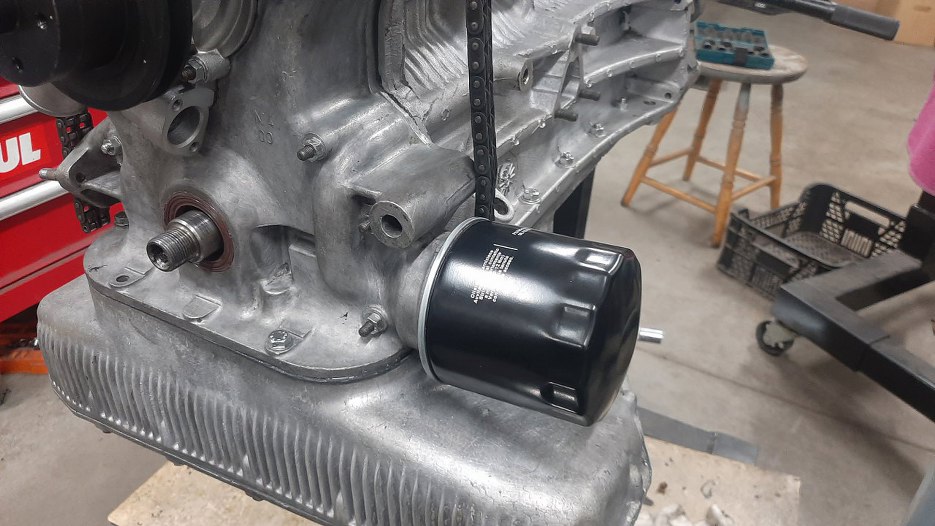 I przykręciłem przód silnika do bloku. Wcześniej jeszcze oczywiście założyłem na wał korbowy zębatkę napędu pompy oleju.
