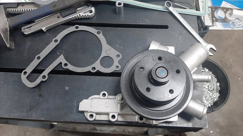 Ponieważ stara pompa wody miała głośnawe łożysko, zamówiona została nowa. Uszczelka pompy wygląda prawie jak uszczelka pompy wody do Toyoty Tacomy z 2004r. :)