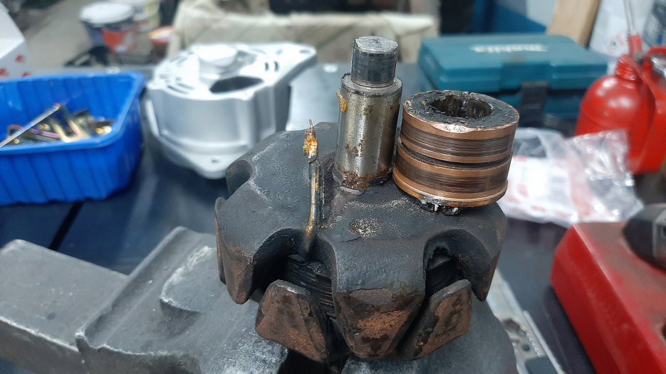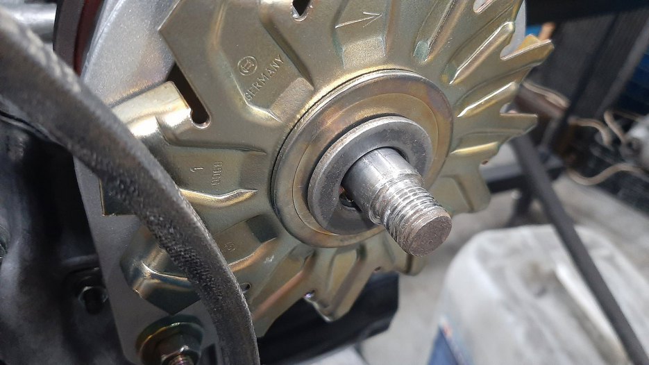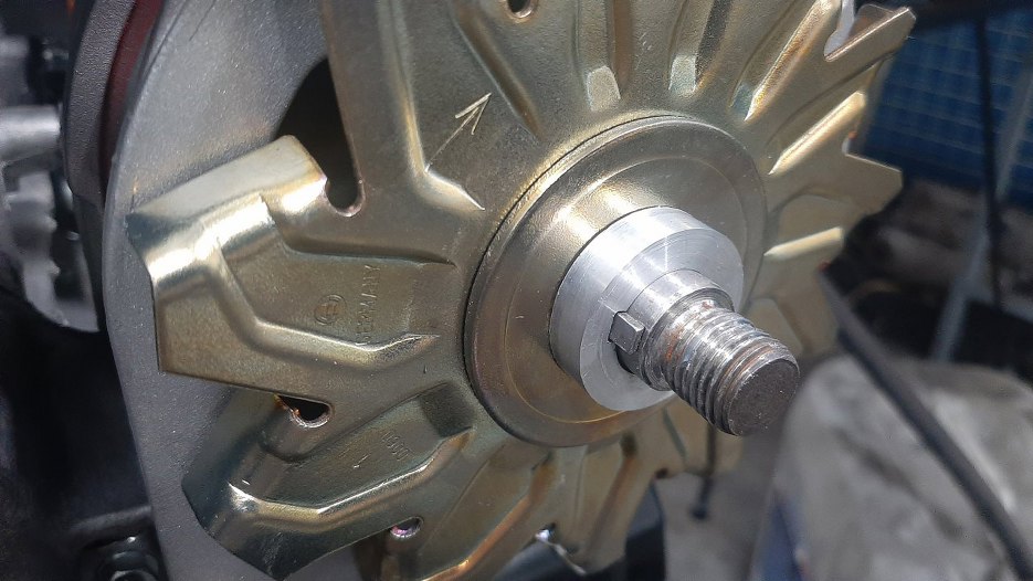 Kawałek o większej średnicy został jak wyszedł. Długość tulejki jest dokładnie taka, żeby weszła w środek mocowania nowego alternatora. Długość tej części o większej średnicy jest taka, żeby wydystansować go maksymalnie do przodu.