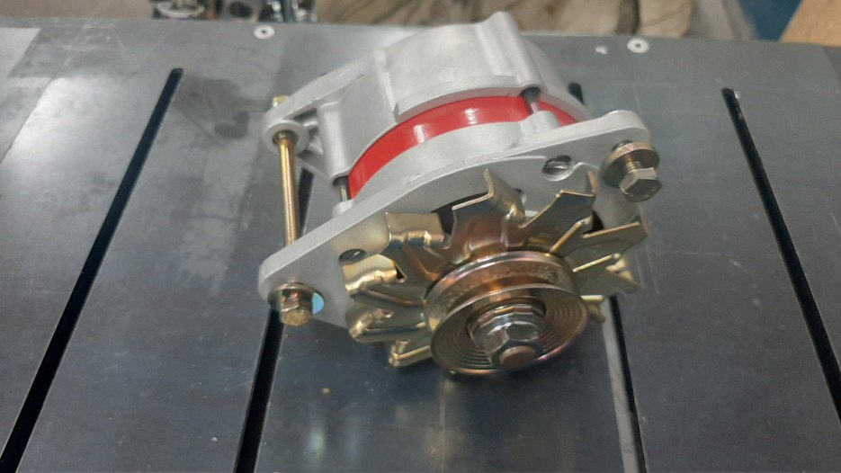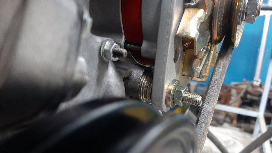 Ten alternator ma nieco szerzej rozsunięte mocowania, więc da się go tam założyć. Mimo przesunięcia go maksymalnie do przodu, nadal nieco jest za daleko w tył, żeby pasek klinowy się nie zsunął.