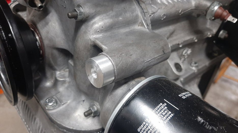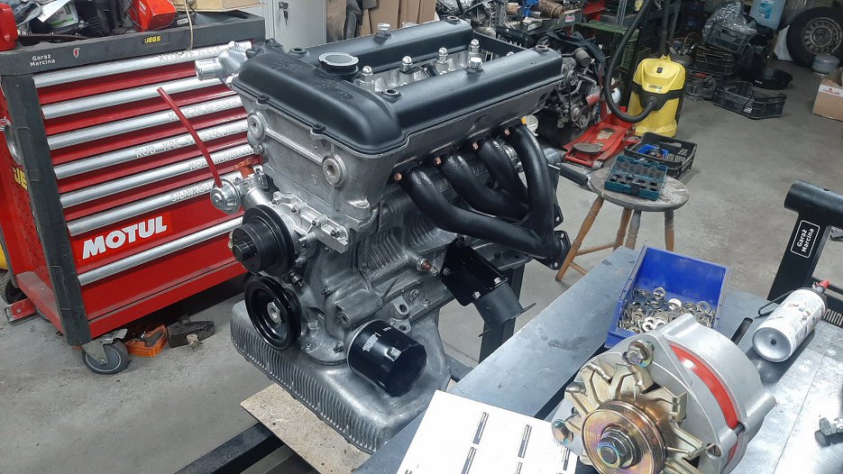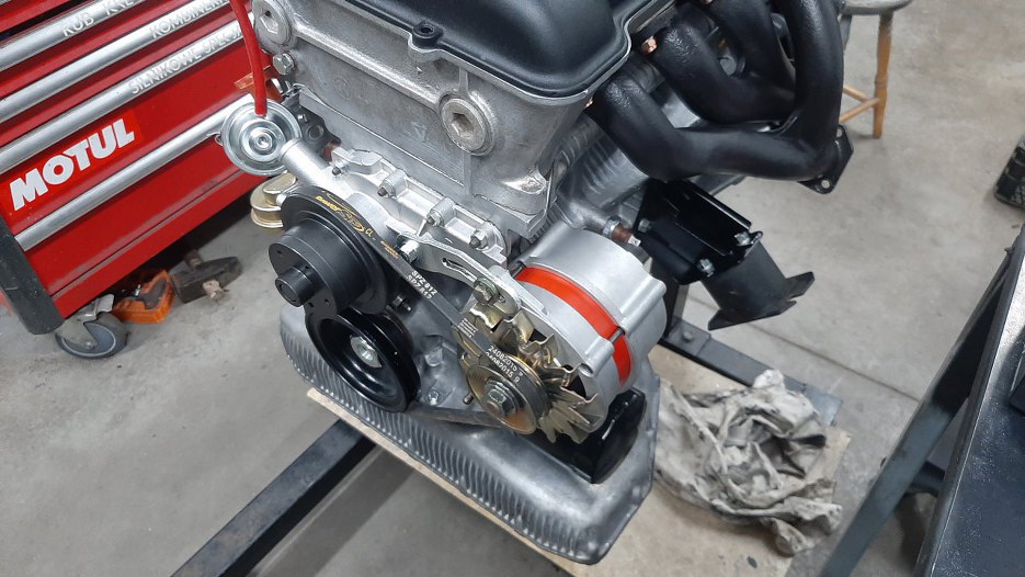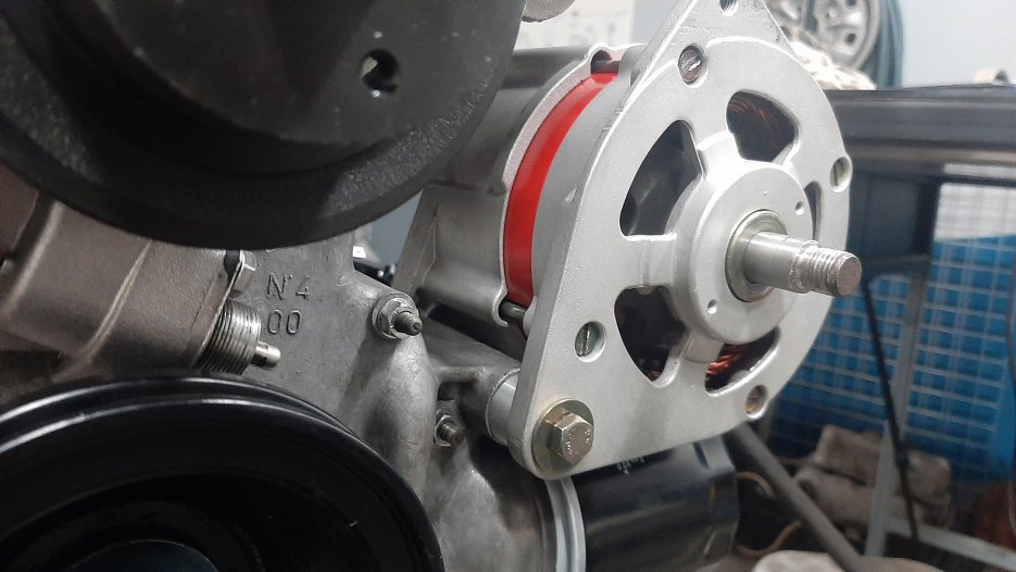 Kolejne zdjęcie ładnego silnika z nienachalnie rzucającym się w oczy alternatorem. Na silnik tymczasowo założyłem pokrywę zaworów, żeby nic tam się nie kurzyło. Rzuć okiem nad filtr oleju. Tam jest mocowanie alternatora. Oryginał pasuje tam bezpośrednio.