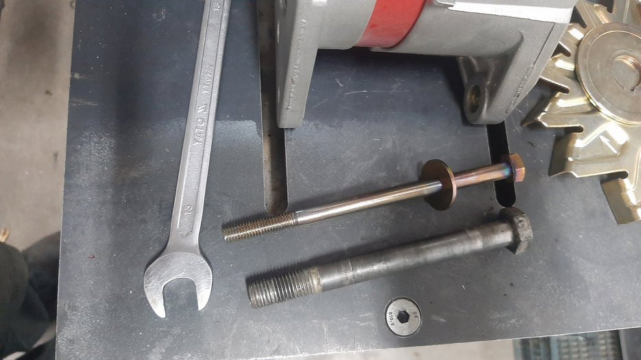 No dobra, to alternator pasuje, ale trzeba to teraz zrobić nieco porządniej. Tu mam starą śrubę, M12, z Magneti Marelli. Powyżej jest nowa, M8 z Boscha. Trzeba to jakoś pożenić.